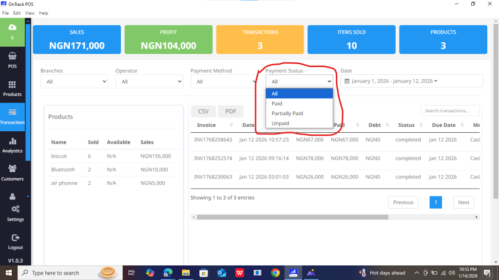 2. In the Payment Status section at the top of the page, click “All” to open a dropdown menu. Select “Unpaid” from the list to display only unpaid transactions. Selecting “All” displays both paid and unpaid transactions.