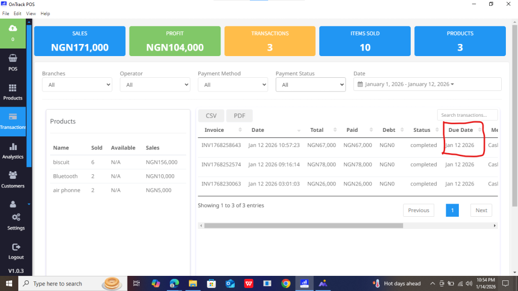 The item in the “Due Date” column turns red once the payment deadline has passed, indicating late payment.