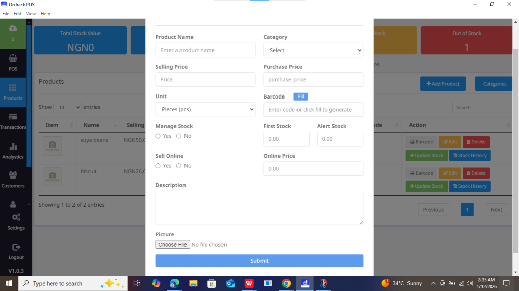 4. Complete the product form and save by clicking on the Submit button from the bottom of the form.