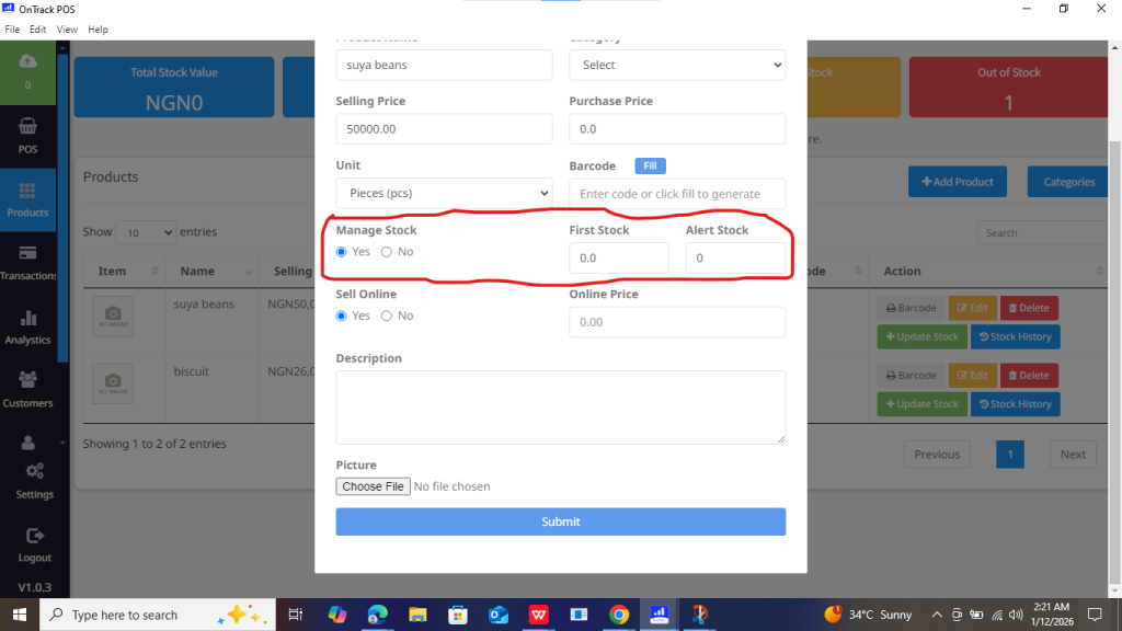 5. Specify quantities for First Stock (current inventory) and Alert Stock (low-stock threshold).