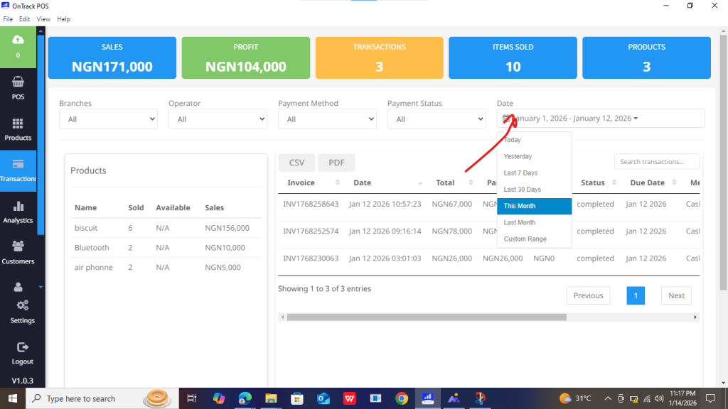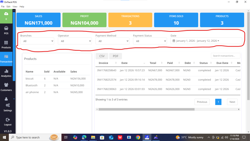 3. At the top of the page, select the Branch, Operator, Payment Method, Payment Status, and Date.