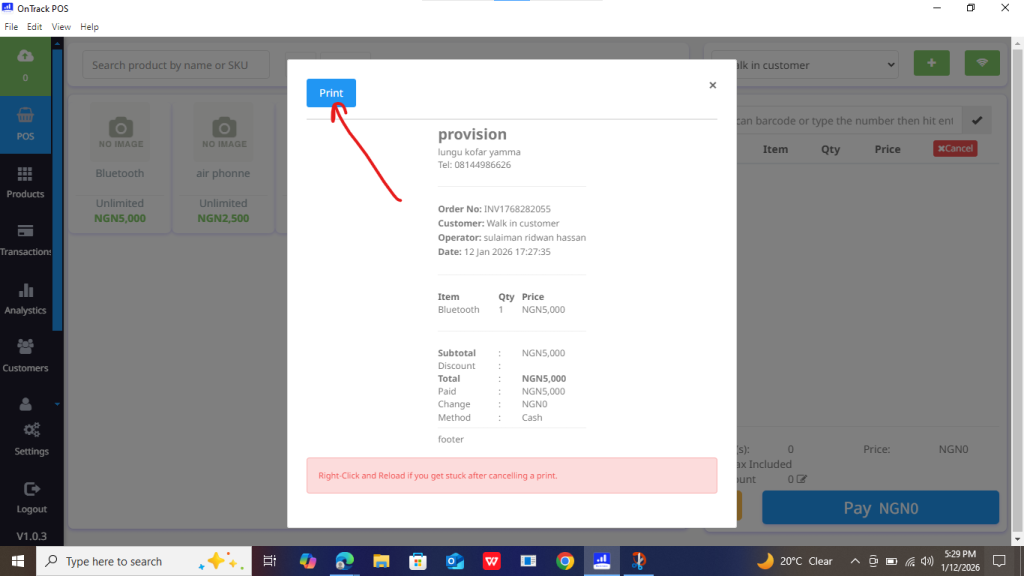 4. Click Print Receipt / Print Bill.